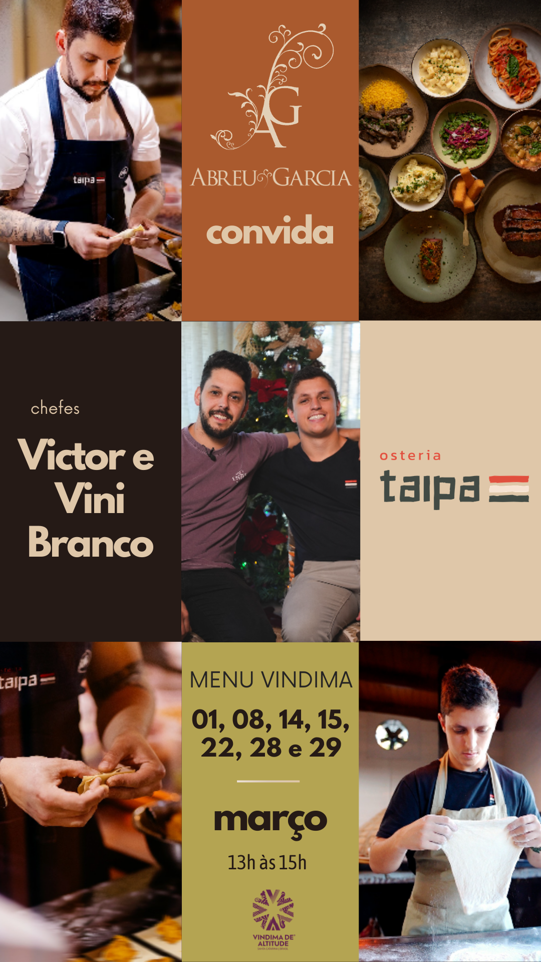Um menu assinado pelos chefes irmãos Victor e Vini Branco, da Osteria Taipa, com 5 etapas: